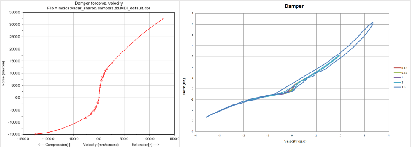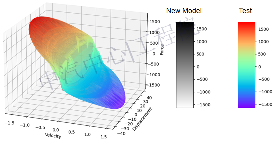 本次開發(fā)的新的減振器模型則采用了全新的方法,可精準(zhǔn)描述減振器在拉伸和壓縮時(shí)的滯環(huán)特性以及“位移-速度-力”之間的力學(xué)特性,模型精度可達(dá)95%以上。