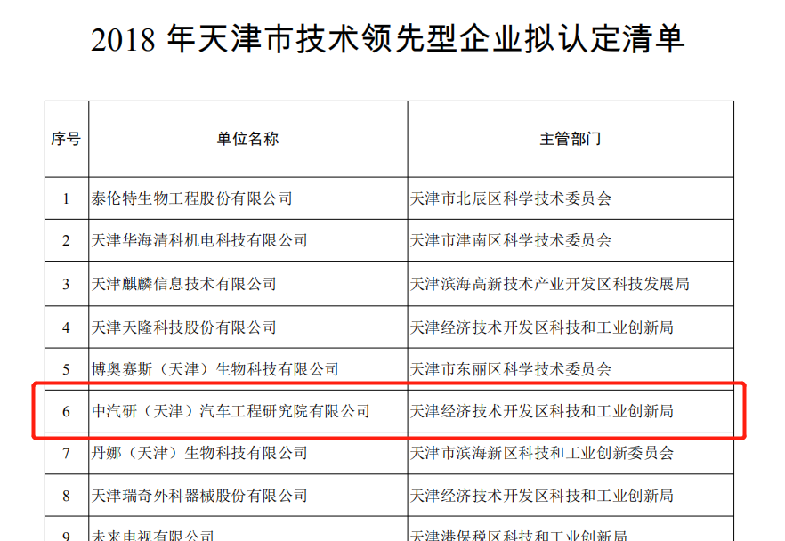 近日,天津市科學技術局公布“2018年天津市技術領先型企業擬認定名單”,中汽研(天津)汽車工程研究院有限公司(以下簡稱“中汽研公司”)成功入選。