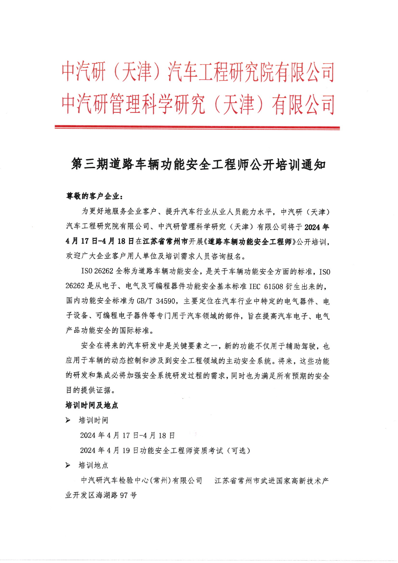 第三期道路車輛功能安全工程師公開培訓通知
