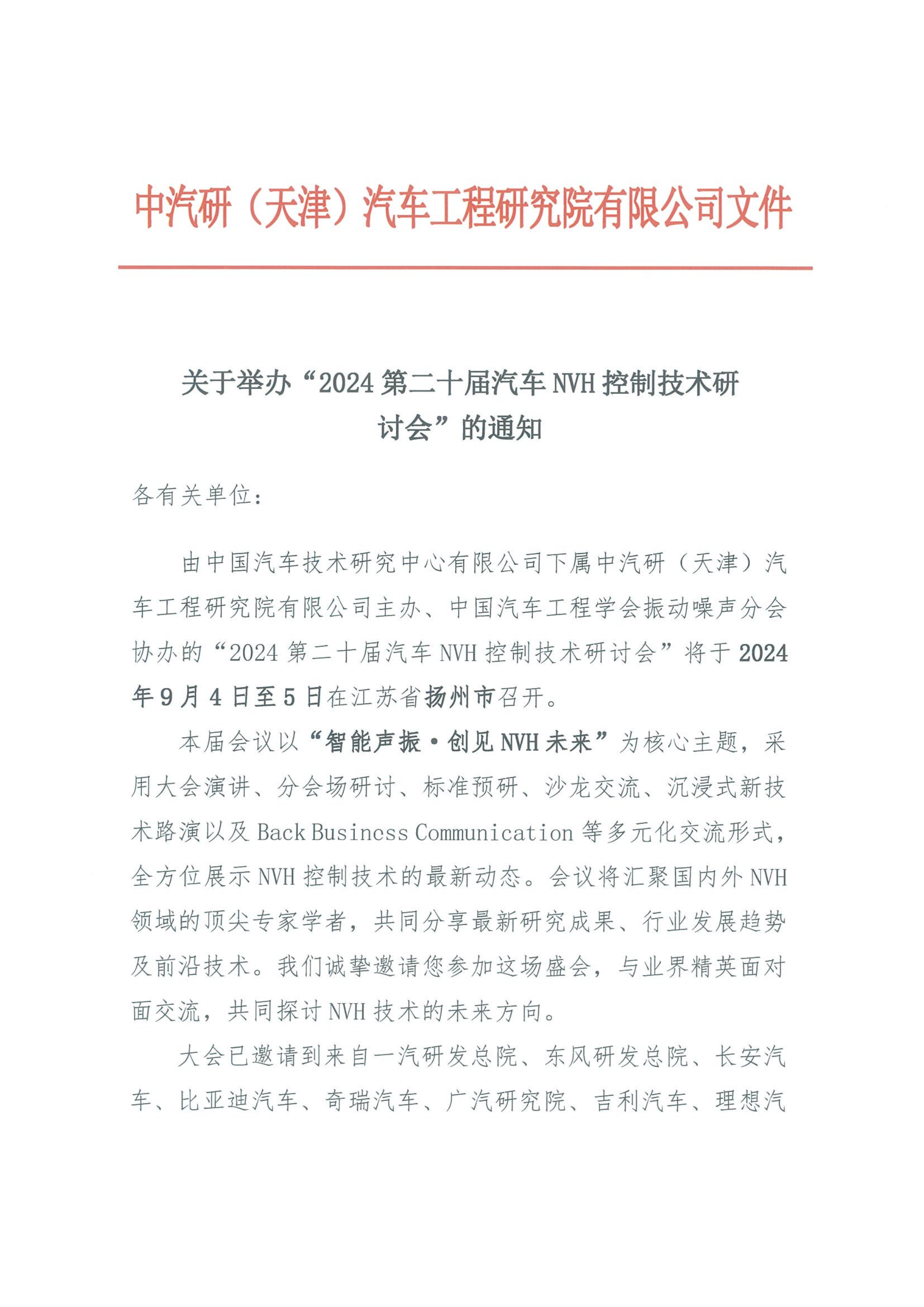 關于舉辦“2024第二十屆汽車NVH控制技術研討會”的通知